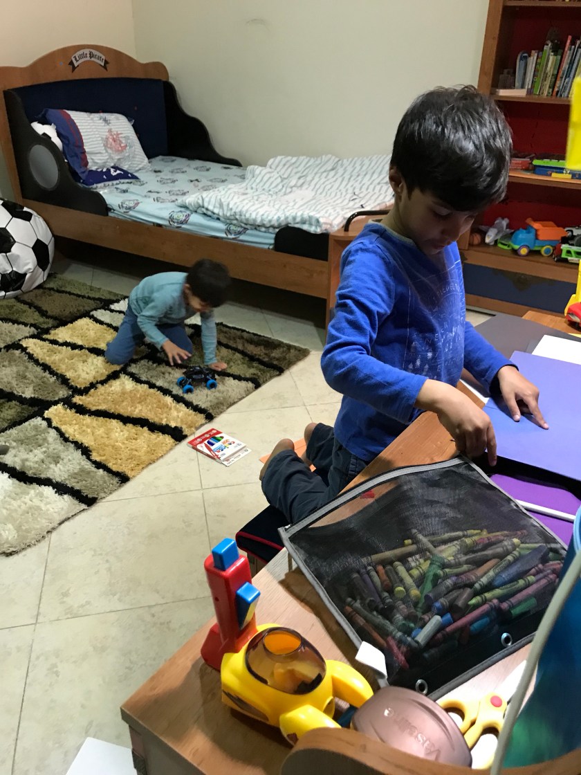 My closet mainly. What is the point? Laundry, dishes, cooking, picking up crayons, markers, so many papers every where, paint. Crayons are back on the floor. There is so Much bending all day. Why do they have to pee so much? Oh I should let them wipe themselves. Yeah. I do. Every time. Only they announce when they enter the toilet. Then they announce when they are done peeing. Then they announce when they’re done flushing. Then they announce when they’re pulling up they’re pants. Then they announce when they’re washing they’re hands. And they don’t move on to the next step until I respond. Also, I have to tell them to stop washing their hands, turn off the faucet, and come out. Also, sometimes they ask me if they need soap or not. Then sometimes we have a healthy discussion about why or why not they need soap after urinating. All the while I’m either picking up crayons or putting away paint for the 5th time. Or Adam is waiting at the bathroom door asking Dawud to hurry up because he has to use the toilet because he is does not want to use the 3 other bathrooms in the house.