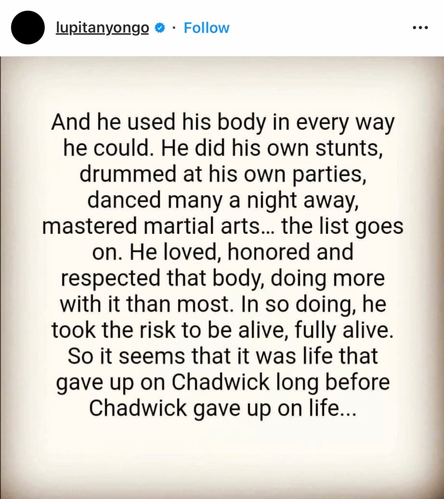 Boseman’s silence about what he went through makes people like me think how challenging it must have been for him. How was he not tired and exhausted every second of every day. If I have any hope of getting out of bed in the morning I need to be on all kinds of meds. These medicines however necessary are not a good look on a person; the swelling, the tiredness, the hair-loss, nausea, headache, I could go on.
